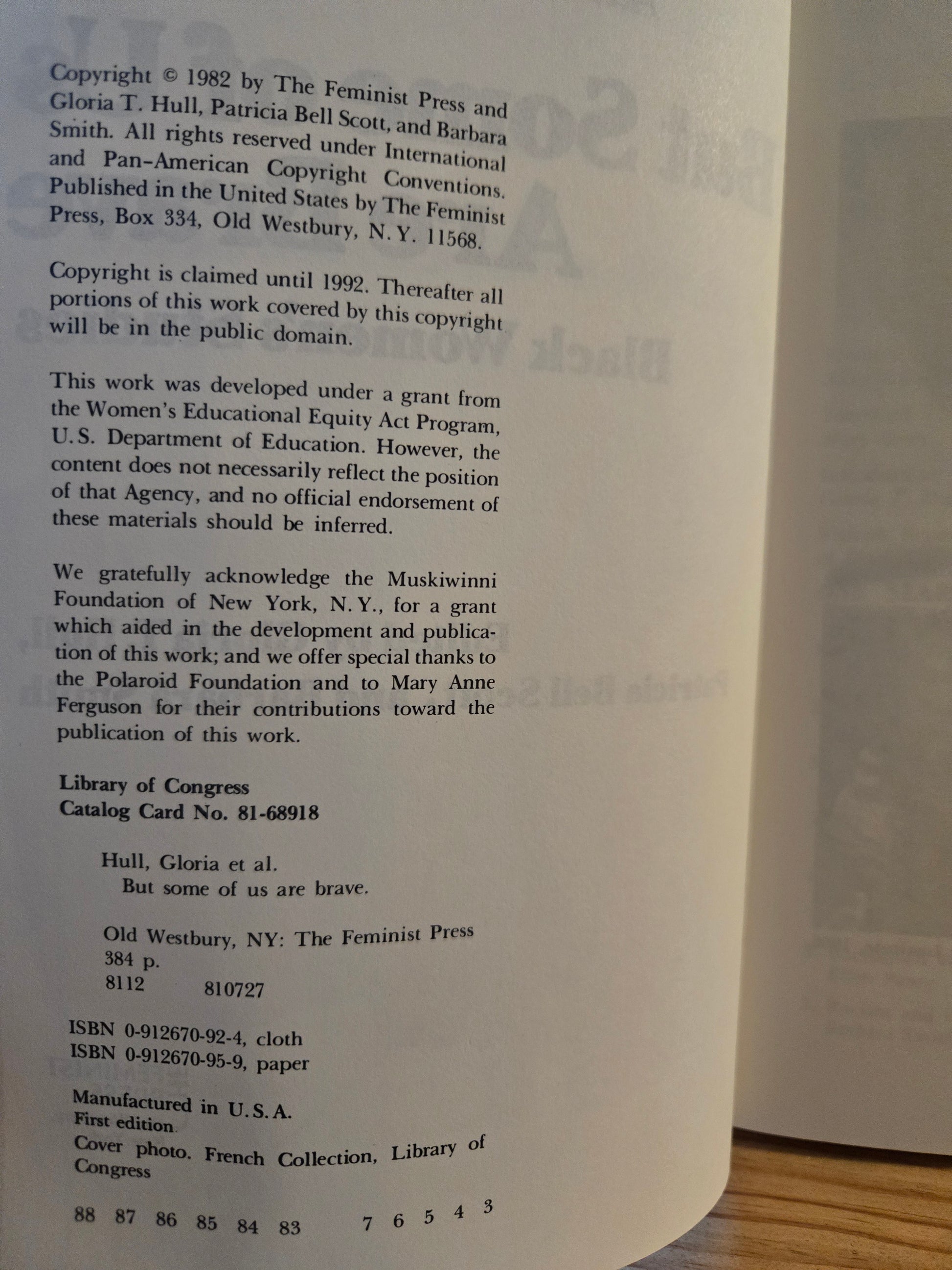 But Some of Us Are Brave: Black Women's Studies // Edited by Gloria T. Hull // 1st Paperback Edition 3rd Printing 1982 // Vintage Paperback
