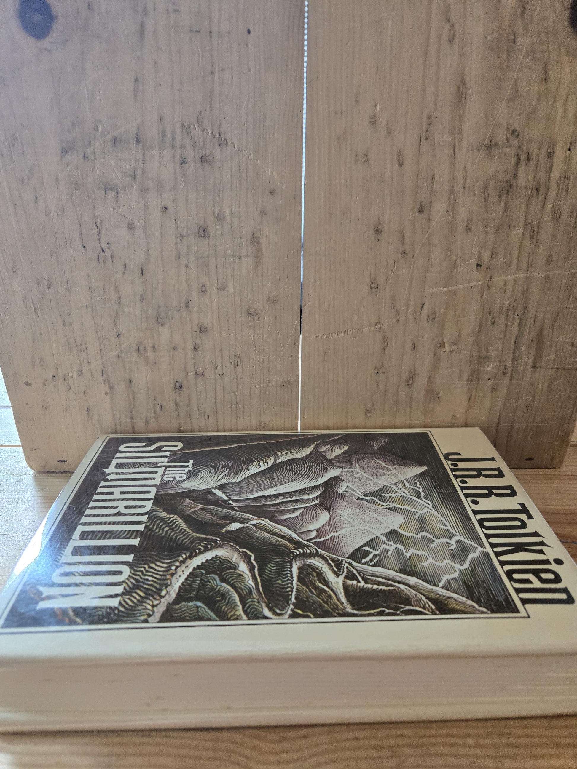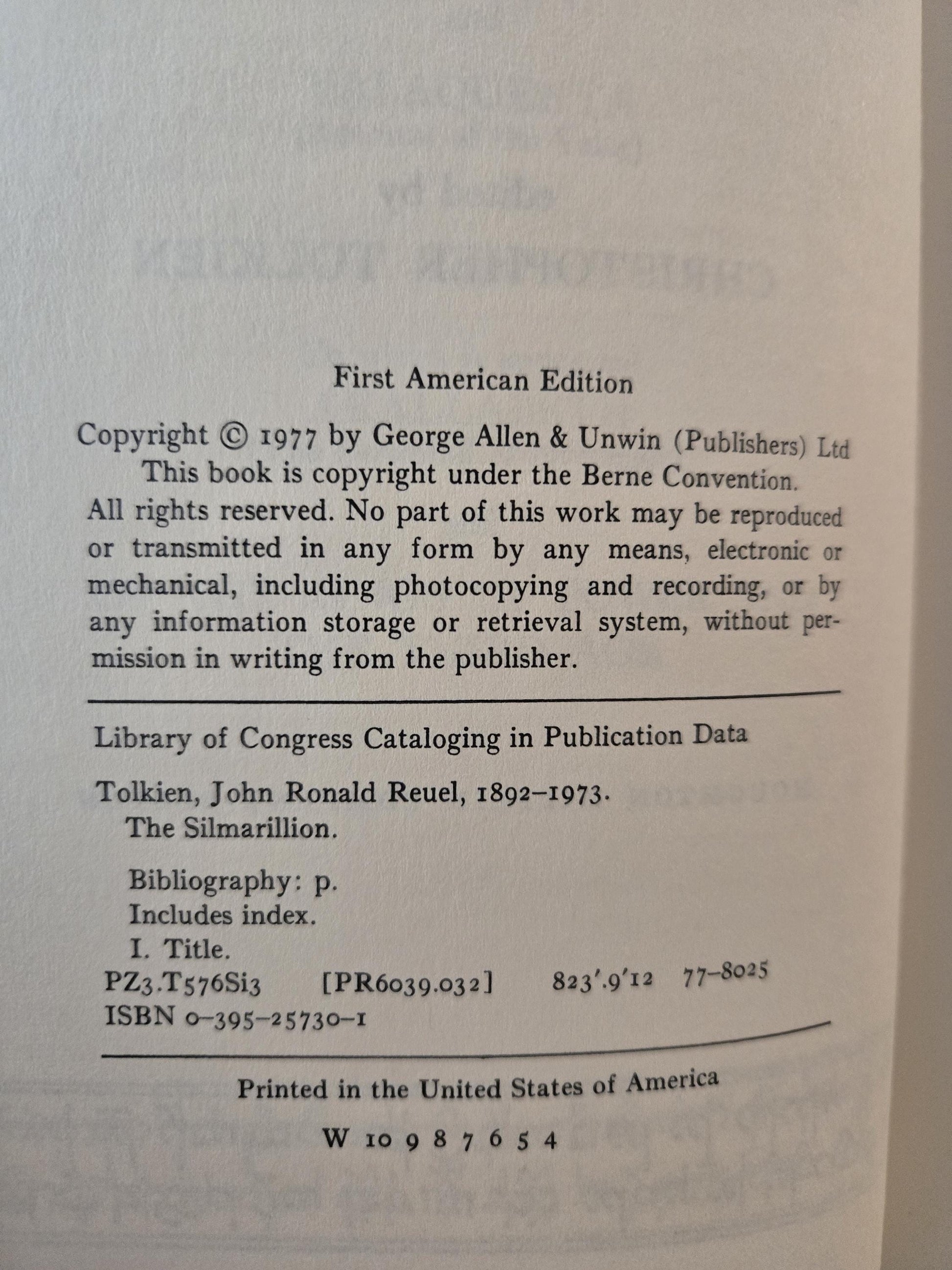 Early U.S. hardcover edition of Tolkien's "The Silmarillion." Includes the fold-out map in the back of the book.