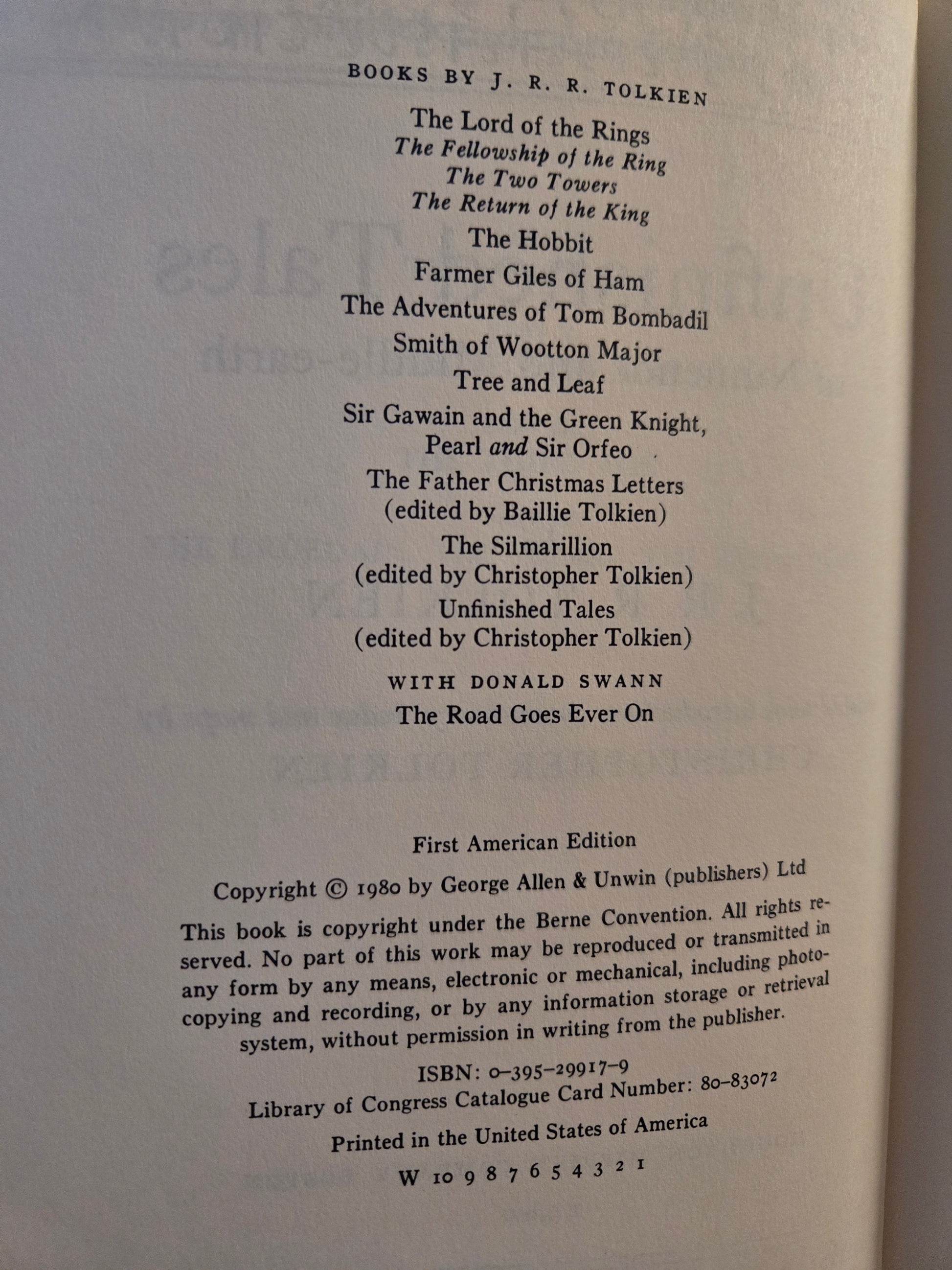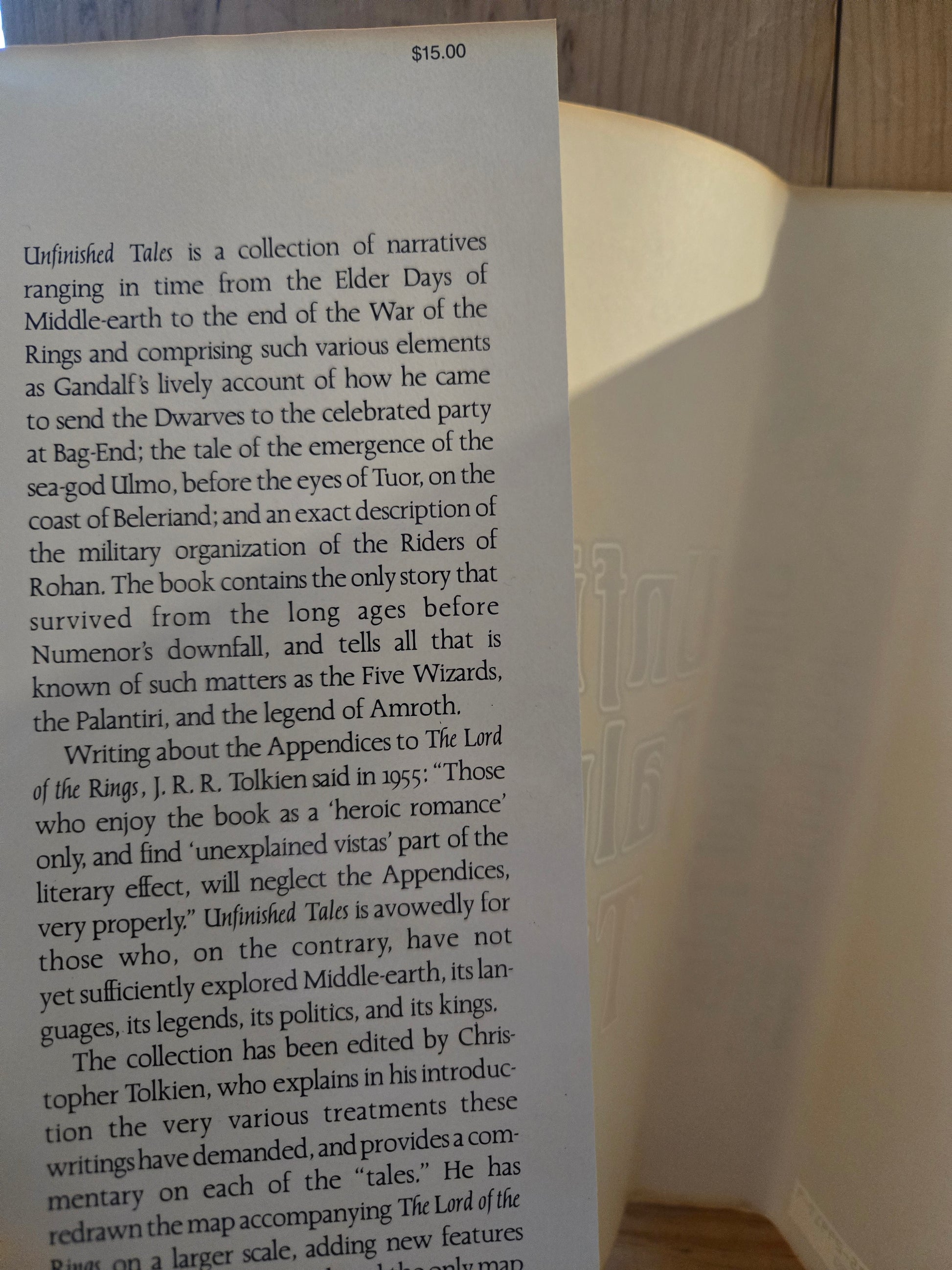 "Unfinished Tales is a collection of narratives ranging in time from the Elder Days of Middle-Earth to the end of the War of the Rings..." Edited with an introduction, commentary, index, and maps by Christopher Tolkien. Includes a fold-out map in the back of the book.